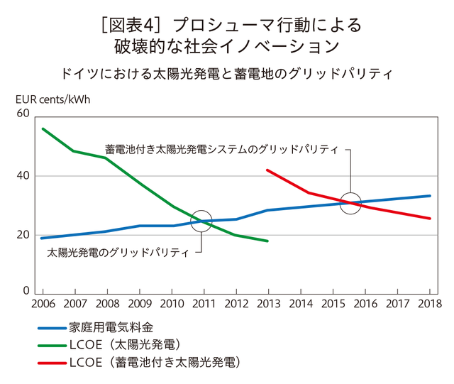 既に欧米、東南アジアの一部の地域では、上記のようなエネルギープロシューマがエネルギーシステムの破壊的イノベーションに大きな影響を与えている[図表4]。例えば、ドイツ等では、家庭用電力(購入)料金は、2018年現在、約35EURcent/kWh程度である。一方で、エネルギープロシューマ(太陽光+蓄電池)のコスト(均等化発電原価)は、約28EURcent/kWhまで低下しているケースもあり、そのコストが、電力購入料金よりも低下するというストレージパリティ(蓄電池の損益分岐点)に達している。この傾向は、電力系統からの電力購入料金が上昇している地域や国では、上記のようなエネルギープロシューマが経済的にも優位性を持ちやすい。加えて、今後もリチウムバッテリーのコストは太陽光と同様に学習曲線に従って低下することが予想される。特に2020年には中国や日本でもEVシフトが政策目標として明示されたが、これによりリチウムバッテリーの普及やコスト低下に拍車がかかるだろう。