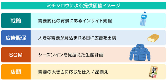 「ミチシロウ」は、予測や最適化の技法を用いてマーケティングのさまざまな意思決定を支援するコンサルティングサービス。購買データ、気象データ、SNS データなど多様なデータを用いて予測・最適化モデルを作成し、従来の方法では捉えられなかったきめ細かな需要や施策の最適パターンを発掘。