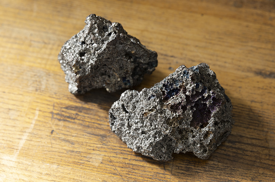 鉧を割り、光沢・硬さ・きめの細かさなどを見ながら、刀づくりにふさわしい部分だけを選び出したものが「玉鋼」です。こうして得られた玉鋼をさらに鍛錬・折り返し・鍛接しながら、日本刀の地鉄へと育てていきます。