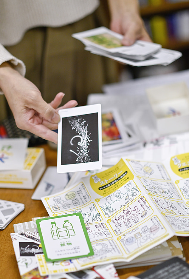 田口 「PLAY!たぐコレ」は、タグチアートコレクションの作品を使った52枚の作品カードと、12種のトークカードのセットで、ご家庭でゲームとして遊べるようにつくられています。例えば「飲み物」というトークカードには「こんなラベルの飲み物。それってどんな味?」と書かれていて、作品カードを飲み物のラベルに見立て、味を想像できるようになっています。学校でのデリバリー展にも持って行き、会場に置いておくと、授業が終わった後に子どもたちが集まって、熱心に遊んでいます。子どもたちは、カードさえあれば自分たちでルールを思い付き、遊びを生み出します。