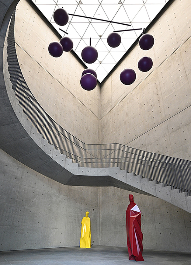 安藤建築は、作品を「置く」ことでその魅力が際立つだけでなく、美術品が置かれることで室内の空間そのものもいきいきとします。秋田県立美術館は三角形のモチーフが随所に使われていますが、今回は、普段は何も置いていない三角形の吹き抜け空間に、そのスケールに合わせて新作を制作していただき、吊り下げ展示しました。