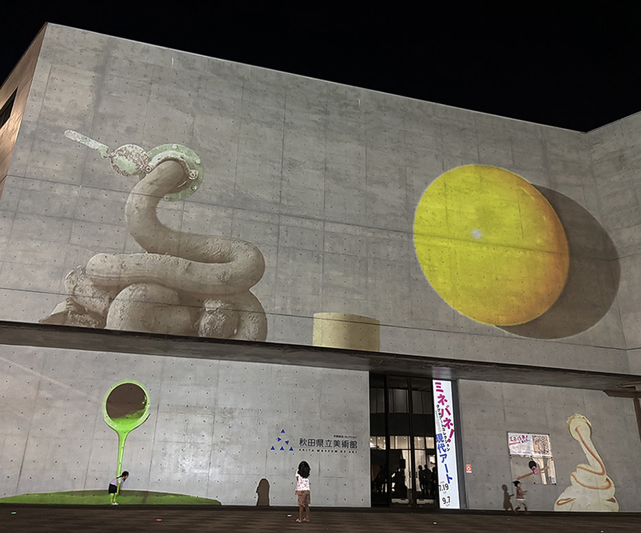 田口 秋田市での展覧会では、出展作家の皆さんによるトークショーやワークショップに加えて、県立美術館のフラットな外壁を活かし、出品作家の金氏徹平さんの協力を得てプロジェクションマッピングの作品も展開しました。壁に穴が開いたように見せて、そこから風船が飛び出してくるという、アイデア満載の演出で、集まった子どもたちがジャンプして風船をつかまえようとする場面もあり、大変盛り上がりました。このときは、子どもたちの描いた絵をその場で投影するインタラクティブ手法も取り入れました。