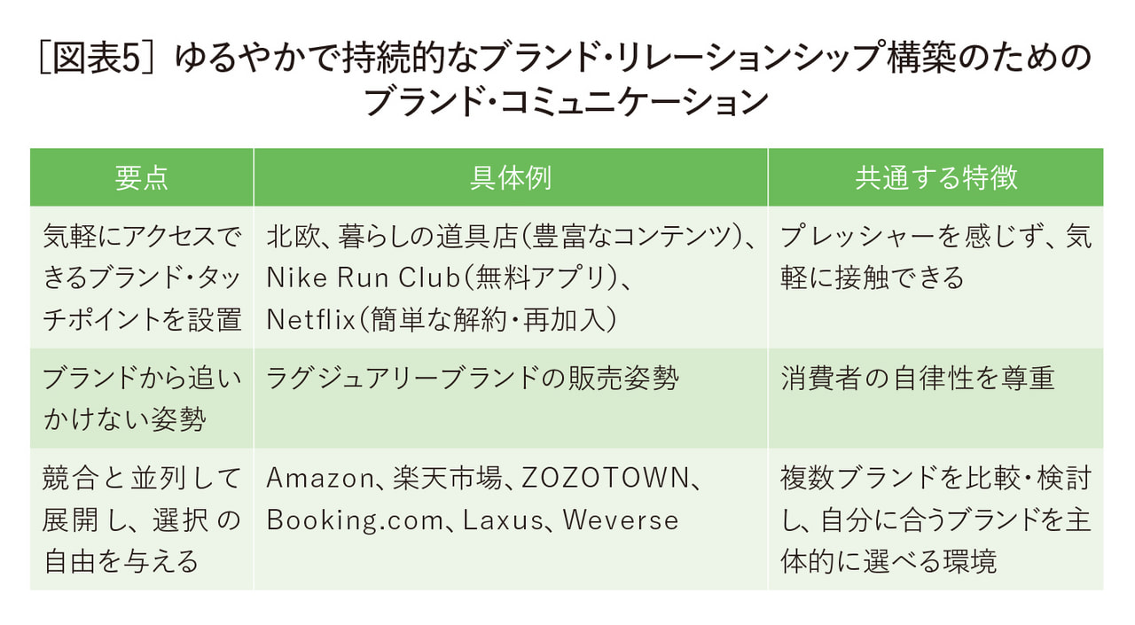 ゆるやかで長期的な関係を築くためには、ブランド側があえて「追いかけない」姿勢を示すことも重要である。過剰なプッシュ型接触を避け、消費者が自ら関わりに来る余地を残すことで、自律性を尊重するブランド姿勢を体現できる。具体的には、広告で過度に購買を迫らないこと、製品ユーザーへのしつこいターゲティング広告を控えること、あるいはサブスクリプション解約時に無理に引き止めないことなどが挙げられる。こうしたアプローチは心理的負担を軽減し、結果としてブランドへの好感を高める。