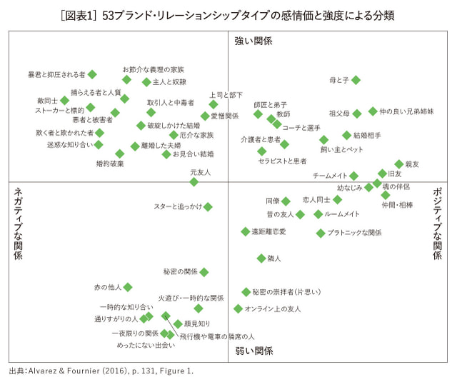 そもそもブランドと消費者の関係は、人間関係と同様に複雑である。強いつながり(例:パートナーや親友)から弱いつながり(例:知人)、ポジティブな関係(例:恋愛)からネガティブな関係(例:敵対)、さらには社会情緒的関係(例:親子)から功利的・機能的関係(例:ビジネス・パートナー)まで、多様な形態が存在する[図表1]。