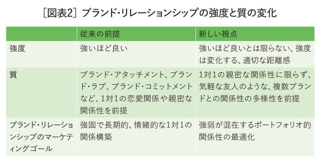 従来のブランド・リレーションシップ研究は、「ブランド・アタッチメント」「ブランド・コミットメント」「ブランド・ラブ」「自己とブランドの結びつき」など、1対1の、強く長期的で情緒的な関係に焦点を当ててきた。そして、その基本的な前提は、「強ければ強いほど良い」というものである[図表2]。強い関係は、ブランド支持やロイヤルティ、再購買といった望ましい成果に結びつくため、企業にとって大きな関心事であったのは当然である。