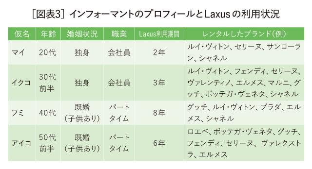 本調査では、20代のマイ、30代のイクコ、40代のフミ、50代のアイコ(全員仮名)という、異なるライフステージの女性4名[図表3]にインタビューを行った。全員に共通してファッションへの関心が高く、ラグジュアリーを「装いを格上げする存在」「視覚的・感覚的な洗練をもたらすもの」と認識していた。また、バブル期を経験したアイコを除き、ラグジュアリーは憧れの対象であり、購入には経済的・心理的負担を伴うため、真剣な検討が必要とされていた。こうした背景から、彼女たちはシェアリングサービスを通じてラグジュアリーを楽しみ、サブスクリプションに否定的な印象はほとんど示さなかった。