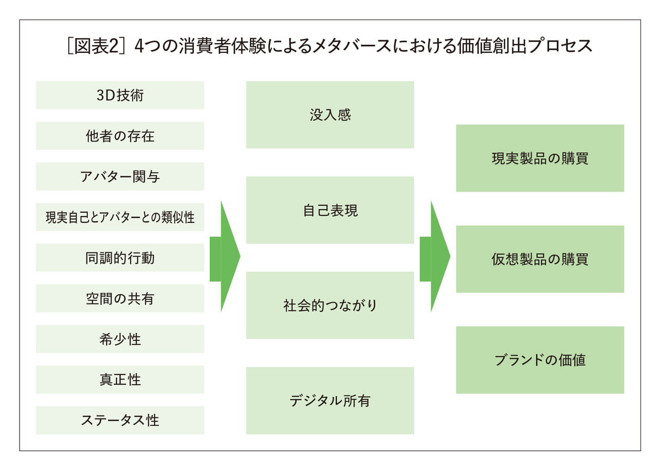 3領域は、それぞれ独自の消費者体験を可能にする。これらの体験が、なぜ、どのようにビジネス成果につながるのかといったことを知ることで、より具体的に企業の実践に活かすことができる。本記事では、[図表1]のように3つの領域と4つの消費者体験との関連を表で整理した。また、[図表2]のように、メタバース体験を成果に変換する4つの消費者体験について、その作用メカニズムを整理した。次ではその詳細について言及する。