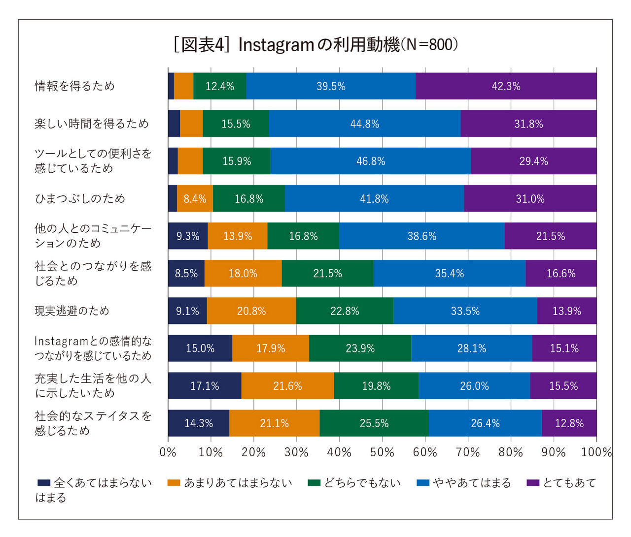 Instagramの利用動機に関する質問の各項目は[図表4]に示す。集計の結果、肯定的回答(「ややあてはまる」「とてもあてはまる」)の割合には差が見られた。まず、「情報を得るため」では、計81.8%が肯定的に回答し、最も高い割合を示した。「楽しい時間を得るため」では76.6%、「ツールとしての便利さを感じているため」では、76.2%が肯定的に評価した。「ひまつぶしのため」に関しては72.8%であった。
