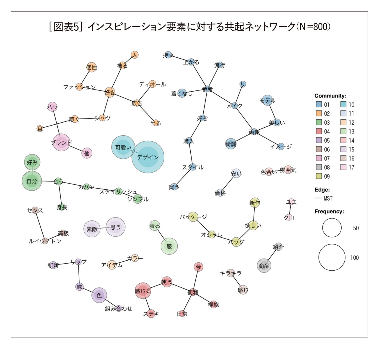 まず、ブランドの要素について確認する。今回の調査では、どのような要素にインスピレーションを感じたのかについて自由記述の回答を得ていた。そこで、KH Coder ver.3. Alpha.17iを用いて、この回答の頻出語を対象に共起ネットワーク分析を行った。その結果を[図表5]に示す(4)。分析の結果、17のサブグラフに分割された。円の大きさは出現数の多さを示す。