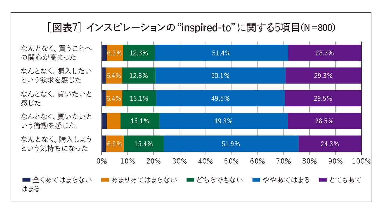 同様に、目標を追求するための動機“inspired-to”に関する5項目の回答を集計した([図表7]を参照)。すべての質問において肯定的回答(「ややあてはまる」「とてもあてはまる」)の割合が7割以上を占めた。具体的には、「なんとなく、買うことへの関心が高まった」では計79.7%が肯定的に回答した。「なんとなく、購入したいという欲求を感じた」では79.4%、「なんとなく、買いたいと感じた」では79.0%、「なんとなく、買いたいという衝動を感じた」では77.8%、「なんとなく、購入しようという気持ちになった」においても76.2%であった。以上の結果から、インスピレーションは購買の動機を高めることが示された。
