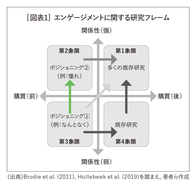 前号の原稿でも示したとおり、これまでのエンゲージメントに関する研究の多くは、ブランドと消費者との関係性が既に構築された状態の研究が主流である(Barari et al., 2020; Santini et al., 2020)。しかし、Brodie et al. (2011)が指摘するように、エンゲージメントは「エンゲージしていない」(non-engaged)、「わずかにエンゲージしている」(marginally-engaged)、「エンゲージしている」(engaged)、「高い状態でエンゲージしている」(very-engaged)といった、低い状態から高い状態までさまざまであり、消費者によって、あるいは対象によってその程度が異なる。これまで、エンゲージメントが形成されていくプロセスに関する研究は概念的な議論はあるものの、実際のプロセスについては十分な検証がなされていない。そこで、今回はこの[図表1]の第3象限(ポジショニング①)から第2象限(ポジショニング②)に向かう縦の矢印部分を明らかにしていく。
