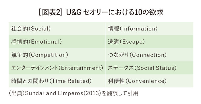 以上のようにU&Gセオリーは幅広いメディアに対して援用されており、新たなメディアが登場するたびに調査が行われている。そして、Sundar and Limperos(2013)は先行研究のレビューを行い、[図表2]のとおり10の欲求にまとめている(3)。当然、新しいメディアが登場するたびに欲求の種類や測定尺度に関して調査を行う必要があるものの、満たされる欲求によってメディアの利用動機が捉えられるというU&Gセオリーの根本的な考え方は広く受け入れられている。さらに、消費者がなぜメディアを利用するのかの理由がわかれば、そこで採用すべきブランドのコミュニケーションの表現やコンテンツのつくり方についても最適化できる。そのため、ゆるいエンゲージメント行動を捉える際には、その要因としてのU&Gセオリーを活用することが有効であると考える。今回はInstagramを対象に動機を調べていく。