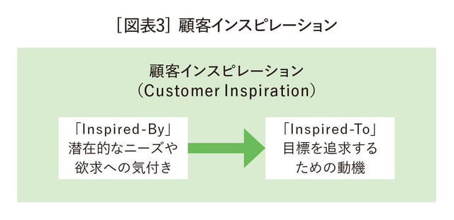 インスピレーションは、製品設計や工学の分野においては古くから知られている考え方であるが、マーケティングの研究に導入されたのは最近のことである。Böttger et al.(2017)は、消費者(顧客)の視点でインスピレーションを定義しており、「マーケティングによって引き起こされ、アイデアを受け入れ、消費に関連する目標追求への動機を促進する一時的な状態」であると示す。この顧客インスピレーションは、「認知的要素」である“inspired-by”と「動機付け要素」である“inspired-to”の2つの構成要素から成り立つものとしている。“inspired-by”は潜在的なニーズや欲求への突然の気付きに関連し、“inspired-to”は消費関連の目標を追求するための動機に関連しており、10項目の測定尺度を開発している([図表3]を参照、測定した結果は次章で示す)。
