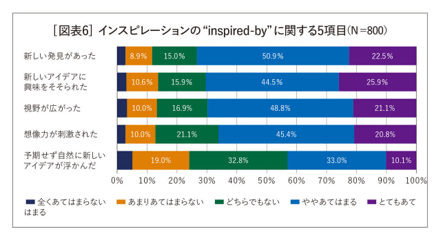 次に、潜在的なニーズや欲求へ気付きを与える“inspired-by”に関する5項目の回答を集計した([図表6]を参照)。すべての質問において肯定的な回答(「ややあてはまる」「とてもあてはまる」)の割合が6割から7割程度を占める結果となった。具体的には「新しい発見があった」では、計73.4%が肯定的に回答した。「新しいアイデアに興味をそそられた」では70.4%、「視野が広がった」では、69.9%が肯定的に評価した。また、「想像力が刺激された」についても66.2%が肯定的な回答であった。一方、「予期せず自然に新しいアイデアが浮かんだ」については肯定的な回答が43.1%であり、他の項目よりも肯定的な回答は低い傾向であった。
