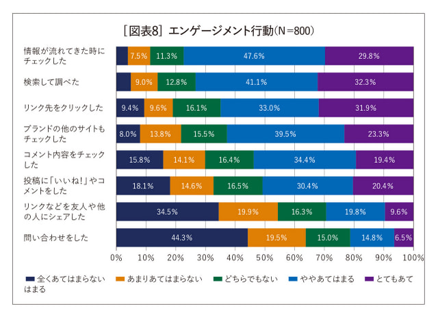 インスピレーションを感じるような投稿を見て、どのようなエンゲージメント行動をとるのかについての質問を集計したところ([図表8]を参照)、各項目における肯定的回答(「ややあてはまる」「とてもあてはまる」)の割合には明確な差が認められた。