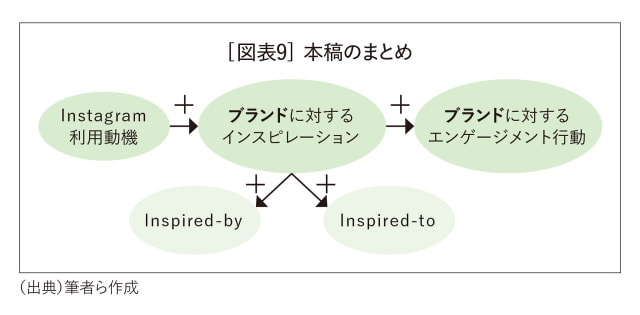 以上から、メディアの利用動機やインスピレーションは「ゆるいエンゲージメント行動」を引き起こすための重要な要因であることが確認された。本稿では紙面の関係で紹介できていないが、実際にこれらの因果関係を分析した結果、Instagramの利用動機が上記のような情報収集として主に用いている場合、ブランドの投稿を見た顧客のインスピレーションが高まるほど、エンゲージメント行動も高まることが明らかになっている([図表9]を参照)(5)。
