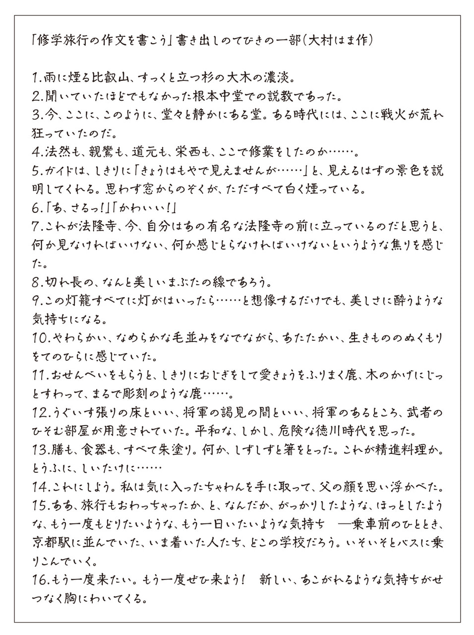 大村の手法は違いました。例えば、作文の導入部分のてびきを、手加減せずに20とおり以上も用意してくれました。どれも魅力的なので、私たちは黙って読んでいくうちに誘われて大村の手法は違いました。例えば、作文の導入部分のてびきを、手加減せずに20とおり以上も用意してくれました。どれも魅力的なので、私たちは黙って読んでいくうちに誘われてしまいます。この上に添えた「修学旅行の作文の書き出しのてびき」を見てください。大村は一緒に旅した人間として、本気になって取材し、書き出しています。その目の付けどころは平凡を脱して鋭く、また温かくて、心が騒ぎます。大村はこの書き出しに続けるようにして作文を書くことを誘っていますが、「つまらないことなど書けないな」と思います。「てびきにない書き出しで、私しか書けないことを書くべきだな」とも思い始めます。「あ、そうだ、あのことを書こう」「誰かが同じことを書かないでいてくれるといいな」と思って工夫するようになる。一人ひとりが記憶を掘り起こし、光を当てていき、本気で「書く人」になっていくのです。